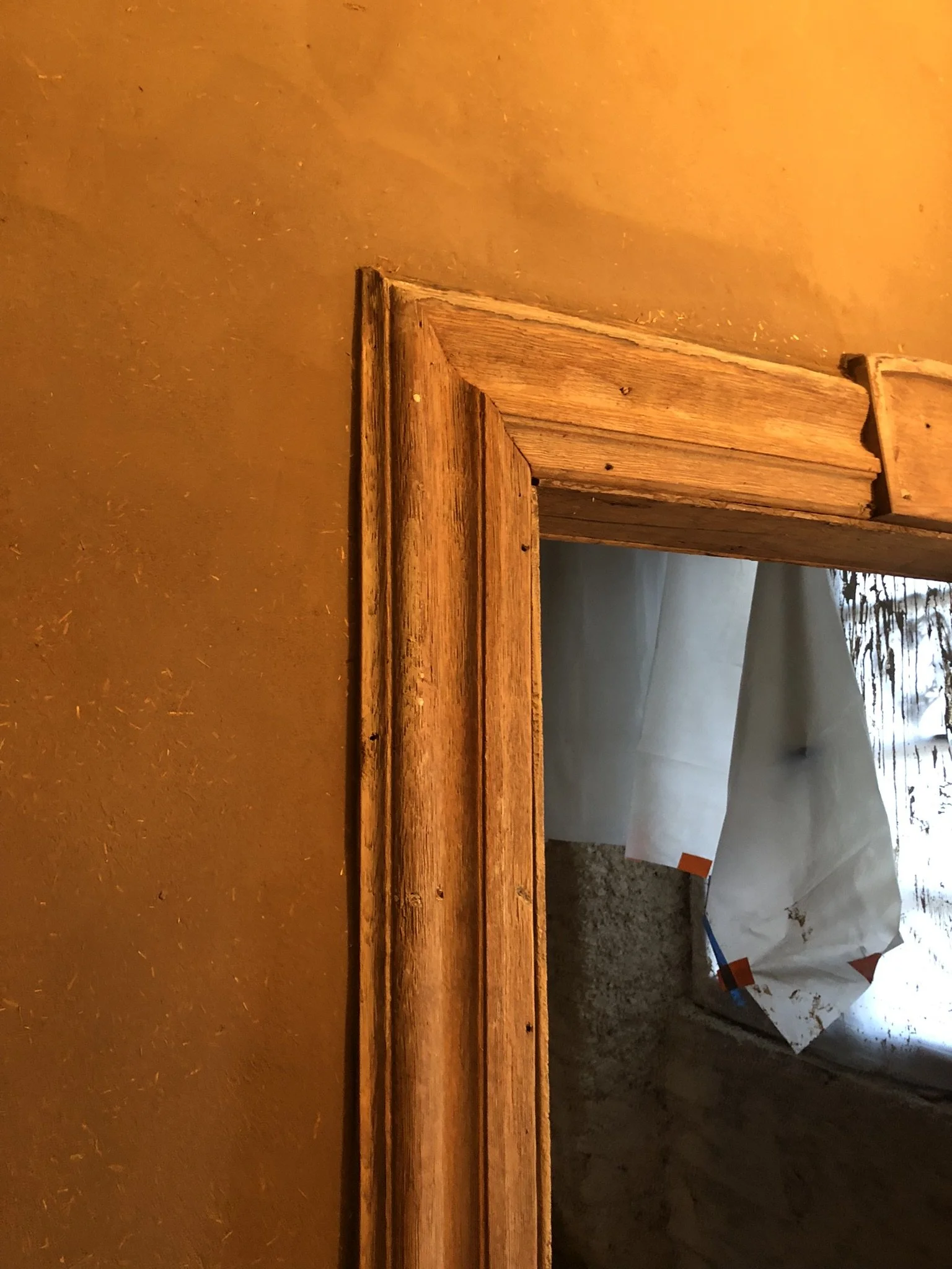 Maison alsacienne Réfection d'un soubassement - enduit à la chaux Rejointoiement d'un muret en grès Enduit de finition Dalle à la chaux Finitions de sol Auto-rénovation accompagnée Animation d'un atelier Adobes Enduit de finition